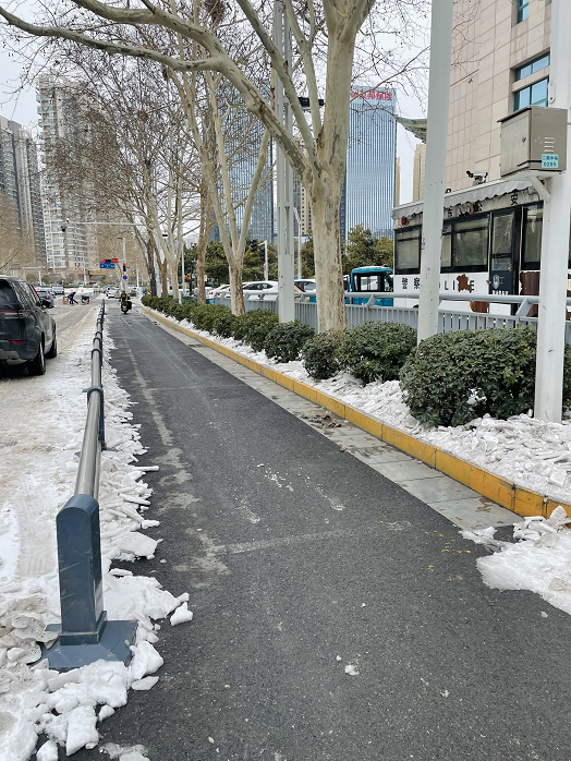 大家用鐵鍬邊敲邊鏟,一點點“攻克”堅硬厚實的冰層,經過共同努力,非機動車道的冰層積雪徹底清除,最終在凍雪中鏟出一條“安心路”,有效保障了附近來往群眾的安全通行。